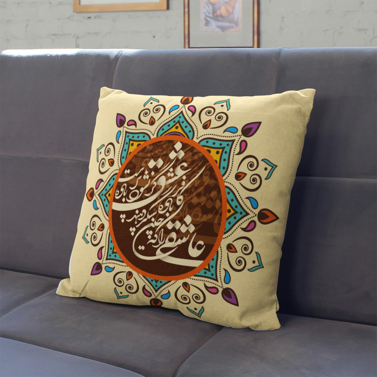 کوسن طرح جذاب خطاطی و فوق العاده زیبا با زیپ مخفی ابعاد ۴۰ در ۴۰ دو رو چاپ شستشو حتی با وایتکس در ضمن میتونید طرح دلخواهتون رو بدین براتون تولید کنیم